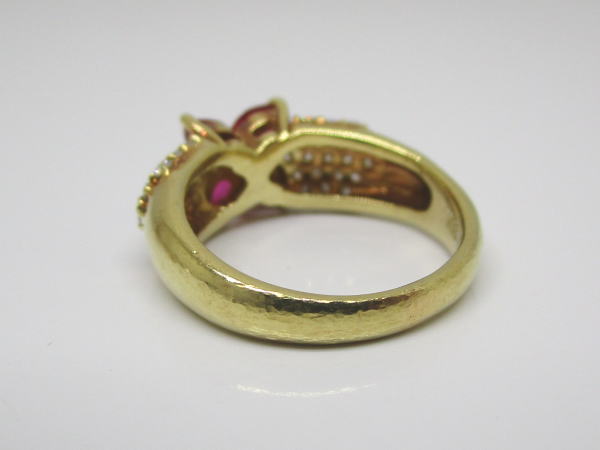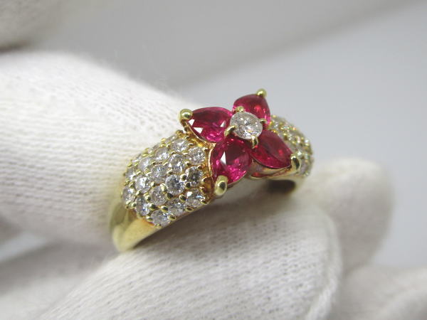 備考 ダイヤが敷き詰められたパヴェリングに花の形にルビーをセットした豪華なデザインのリングです。